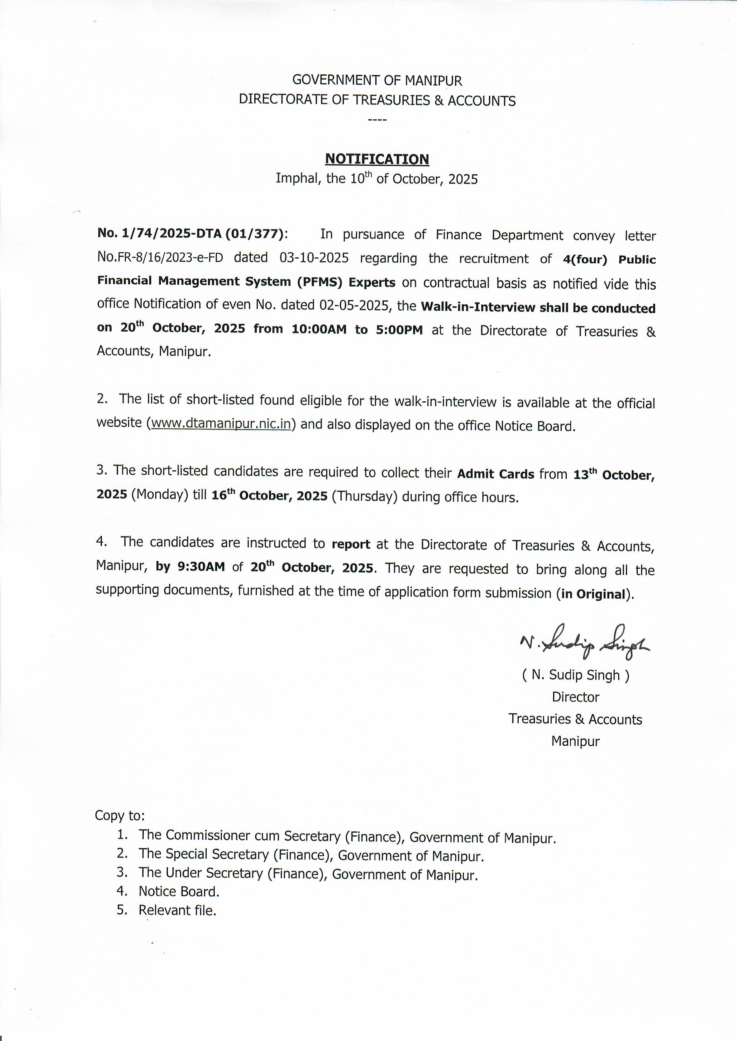 Notification dated 10/10/2025 - Walk-in-Interview for recruitment of PFMS Experts (on Contract Basis)